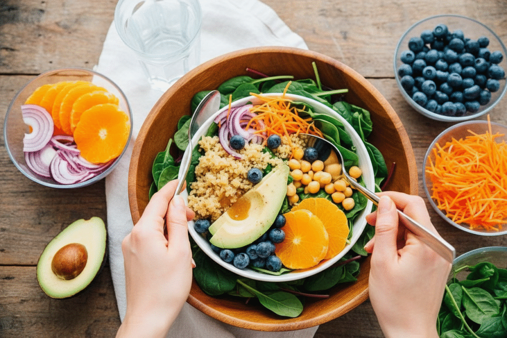 - Step 3: Now for the fun part! Let’s add all our colorful toppings. Think of it like painting. Add chickpeas for protein, then bright blueberries and orange slices. The avocado makes it creamy. Finally, sprinkle on the shredded carrot and red onion. Do you think the red onion is too strong? Share below!