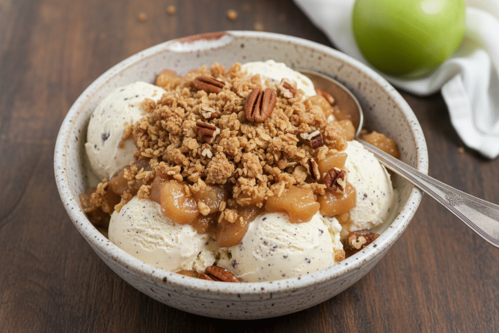 Hello, my dear. Pull up a chair. Let’s make a memory in a bowl. This recipe is like autumn in your freezer. It has cozy apple pie filling and a crunchy oat topping. I think it’s pure happiness with a spoon. My grandson calls it “pie cream.” I still laugh at that. Making ice cream is a little project. But every step is worth it. The smell of baking crisp topping is amazing. It makes the whole kitchen feel warm.