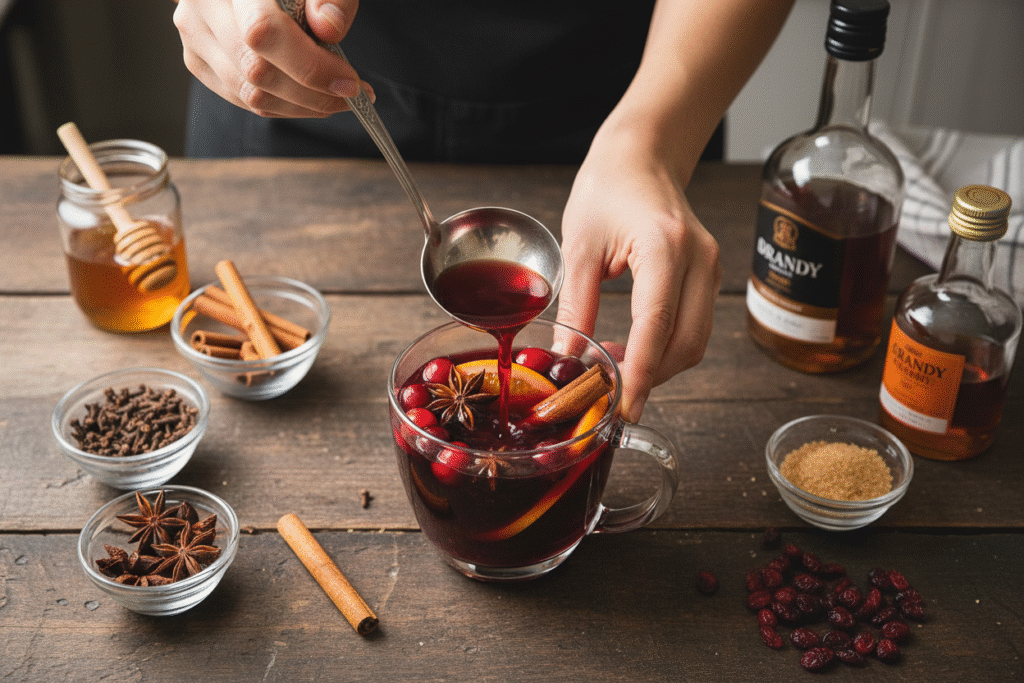 Step 4: Ladle the warm wine into mugs. Use a spoon to catch the spices. Add a fresh orange slice to each. A cinnamon stick makes a perfect stirrer. Then wrap your hands around the warm mug. Take a small sip. It feels like a warm hug from the inside.