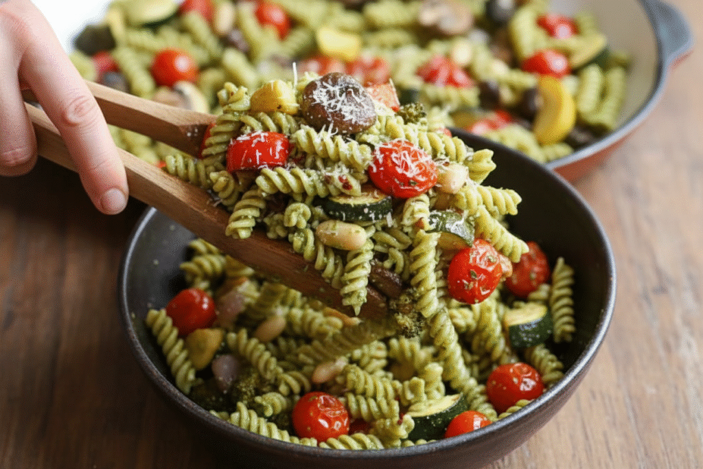 While the veggies roast, cook your pasta. Save a little of the starchy water. This is a chef’s secret. It helps the pesto coat every noodle. Then just mix it all in a big bowl.