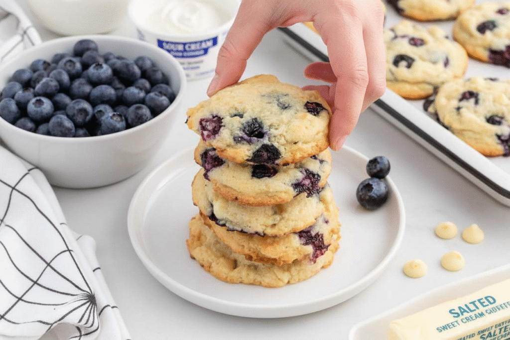 Overmixing makes tough cookies. We want them soft and cake-like. Gently fold in the blueberries last. This keeps them whole and pretty. What’s your best cookie-making tip? I’d love to hear it.