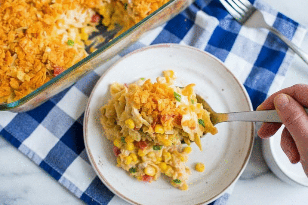 Time for the fun part! Take the casserole out of the oven. Crush a bag of Nacho Cheese Doritos right in the bag. Sprinkle those golden crumbs all over the top. The heat will make them extra fragrant. Serve it up warm and enjoy the smiles.