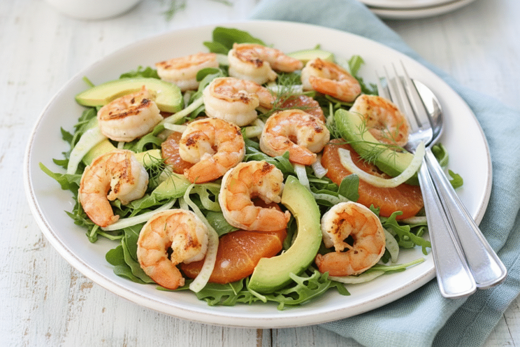Bright, fresh salad with grilled shrimp, creamy avocado, crisp fennel, and juicy oranges. A perfect light & flavorful meal for any occasion.