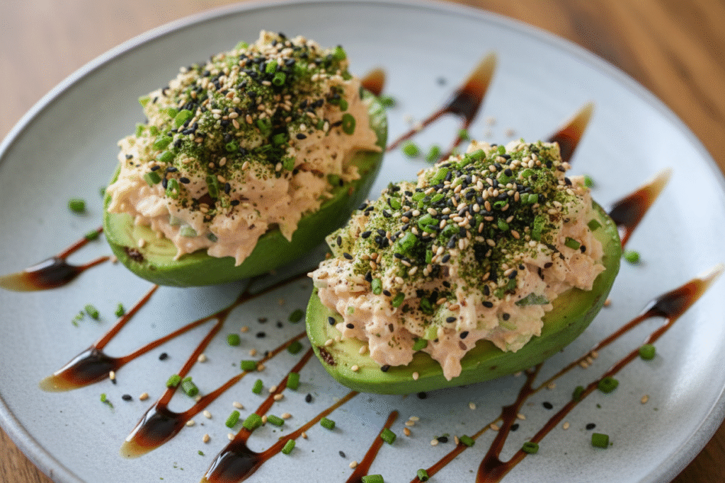 - Step 4: Divide the crab salad between your two avocado halves. Pile it up high! Now for the magic. Sprinkle the top with furikake or sesame seeds. They add a nice little crunch. Finally, drizzle just a bit of gluten-free soy sauce over everything. This brings all the flavors together so nicely.