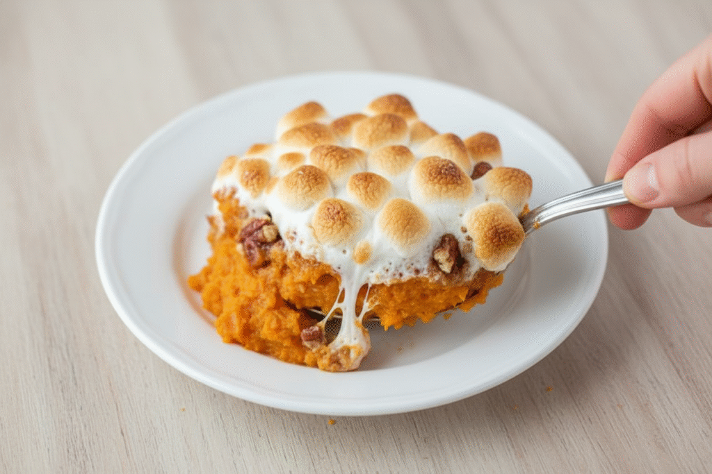 Bake it for 30 minutes. Then comes act two: the marshmallows. This is where you need to watch. Broil just until they are golden. Turn on the oven light and stare. They burn in a blink. What’s your favorite part, the pecans or the marshmallows? Tell me in the comments.